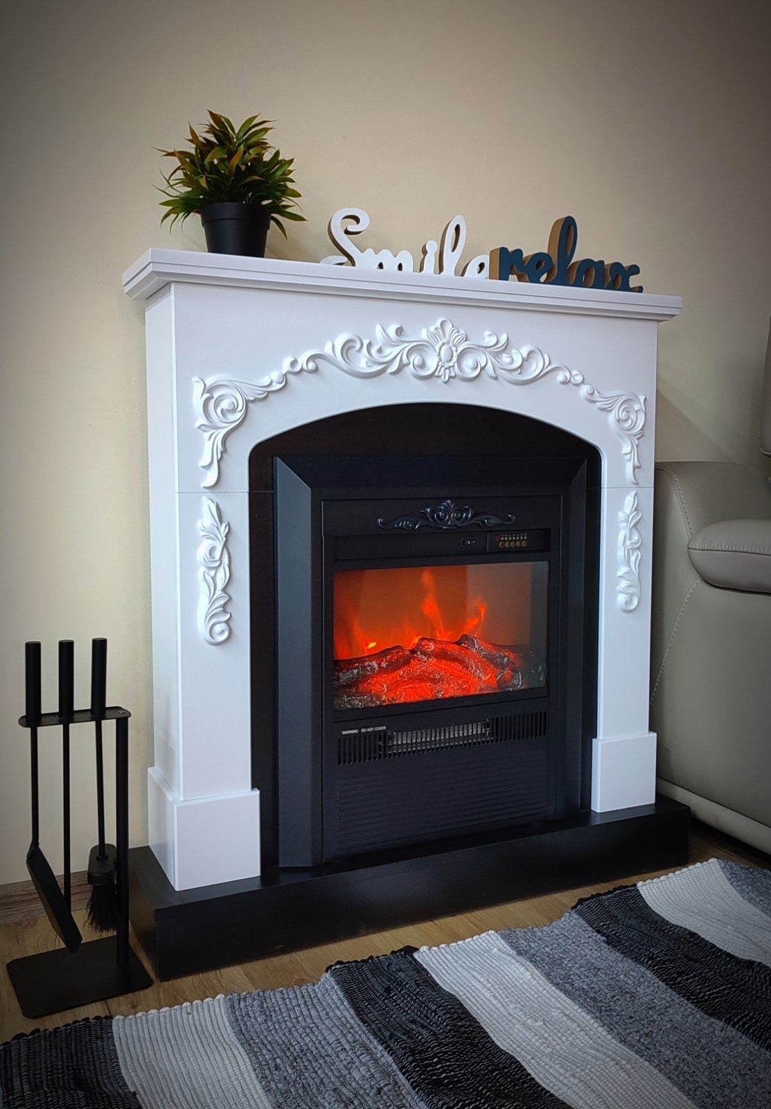 Electric fireplace "Christina", made in a standard format with a small hearth and atmospheric style. The device is capable of operating in 2 modes: in decorative mode and heating mode. In decorative mode, the device creates a cozy atmosphere with a high-quality simulated flame, the brightness of which can be changed using the remote control that comes with the kit. In heating mode, the electric fireplace is able to heat a room of 20m2. Overheating protection is responsible for the safety of the fireplace.